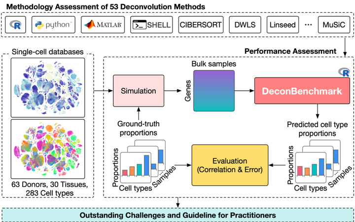 “Single-cell RNA sequencing (scRNA-Seq) is a recent technology that allows for the measurement of the expression of all genes in each individual cell contained in a sample. Information at the single-cell level has been shown to be extremely useful in many areas. However, performing single-cell experiments is expensive. Although cellular deconvolution cannot provide the same comprehensive information as single-cell experiments, it can extract cell-type information from bulk RNA data, and therefore it allows researchers to conduct studies at cell-type resolution from existing bulk datasets. For these reasons, a great effort has been made to develop such methods for cellular deconvolution. The large number of methods available, the requirement of coding skills, inadequate documentation, and lack of performance assessment all make it extremely difficult for life scientists to choose a suitable method for their experiment. This paper aims to fill this gap by providing a comprehensive review of 53 deconvolution methods regarding their methodology, applications, performance, and outstanding challenges. More importantly, the article presents a benchmarking of all these 53 methods using 283 cell types from 30 tissues of 63 individuals. We also provide an R package named DeconBenchmark that allows readers to execute and benchmark the reviewed methods (https://github.com/tinnlab/DeconBenchmark)."