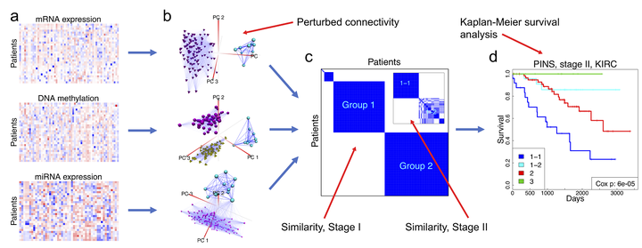 PINSPlus is fast and supports the analysis of large datasets with hundreds of thousands of samples and features. The software automatically determines the optimal number of clusters and then partitions the samples in a way such that the results are robust against noise and data perturbation. PINSPlus improves two algorithms of PINS (Nguyen et al., 2017; Nguyen, 2017; Nguyen et al., 2019): i) PerturbationClustering() to cluster a single data type, and ii) SubtypingOmicsData() to integrate omics data. When only a single data type is available, PINSPlus uses PerturbationClustering() function to perform sub-typing. The method is super fast, highly scalable, and can subtype hundreds of thousands of samples in under three minutes. We implement an ensemble strategy to optimize the running time while maintaining patient partitioning performance. We use singular value decomposition (SVD) and randomized singular value decomposition (RSVD) to project the original data to lower dimensional space. Then, we repeatedly perturb the subspace data by adding Gaussian noise and cluster the patients using different cluster numbers. The clustering assignment that gives the best agreement between the perturbed and original data yields the optimal subtype. When the dataset contains a large number of patients, we perform subtyping on a subset of size 2,000 and map the unpartitioned patients to the closest subtype using K nearest neighbors (KNN) algorithm. We use the SubtypingOmicsData() function when muti-omics data types are available. The method performs multiple stages of perturbation clustering and outputs patient connectivity graphs for each data type. The graphs that are resilient across all data types yield the most agreed number of patient subtypes.
