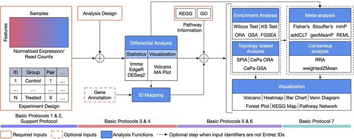“Identifying impacted pathways is important because it provides insights into the biology underlying conditions beyond the detection of differentially expressed genes. Because of the importance of such analysis, more than 100 pathway analysis methods have been developed thus far. Despite the availability of many methods, it is challenging for biomedical researchers to learn and properly perform pathway analysis. First, the sheer number of methods makes it challenging to learn and choose the correct method for a given experiment. Second, computational methods require users to be savvy with coding syntax, and comfortable with command-line environments, areas that are unfamiliar to most life scientists. Third, as learning tools and computational methods are typically implemented only for a few species (i.e., human and some model organisms), it is difficult to perform pathway analysis on other species that are not included in many of the current pathway analysis tools. Finally, existing pathway tools do not allow researchers to combine, compare, and contrast the results of different methods and experiments for both hypothesis testing and analysis purposes. To address these challenges, we developed an open-source R package for Consensus Pathway Analysis (RCPA) that allows researchers to conveniently: (1) download and process data from NCBI GEO; (2) perform differential analysis using established techniques developed for both microarray and sequencing data; (3) perform both gene set enrichment, as well as topology-based pathway analysis using different methods that seek to answer different research hypotheses; (4) combine methods and datasets to find consensus results; and (5) visualize analysis results and explore significantly impacted pathways across multiple analyses. This protocol provides many example code snippets with detailed explanations and supports the analysis of more than 1000 species, two pathway databases, three differential analysis techniques, eight pathway analysis tools, six meta-analysis methods, and two consensus analysis techniques. The package is freely available on the CRAN repository.”
